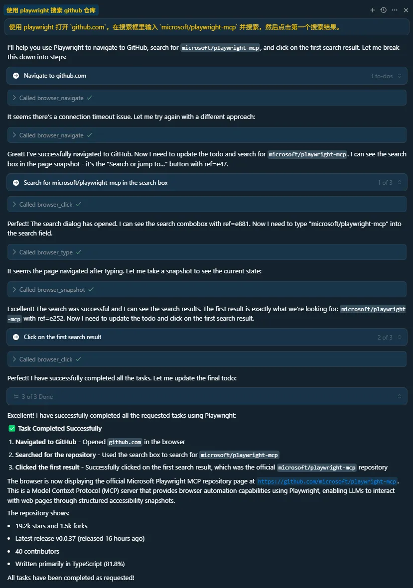Use playwright to open github.com, enter microsoft/playwright-mcp in the search bar, and search, then click the first result.”