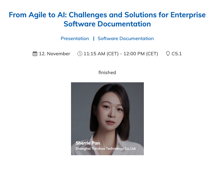 At the conference, Sherrie Pan, Technical Documentation Manager at ZStack, delivered a presentation titled “From Agile to AI: Challenges and Solutions for Enterprise Software Documentation“. She discussed two key challenges facing today’s technical communicators – agile documentation delivery and domain-specific translation – and shared how ZStack has addressed them through the independent development of its Documentation DevOps Platform and AI Translation Platform.
